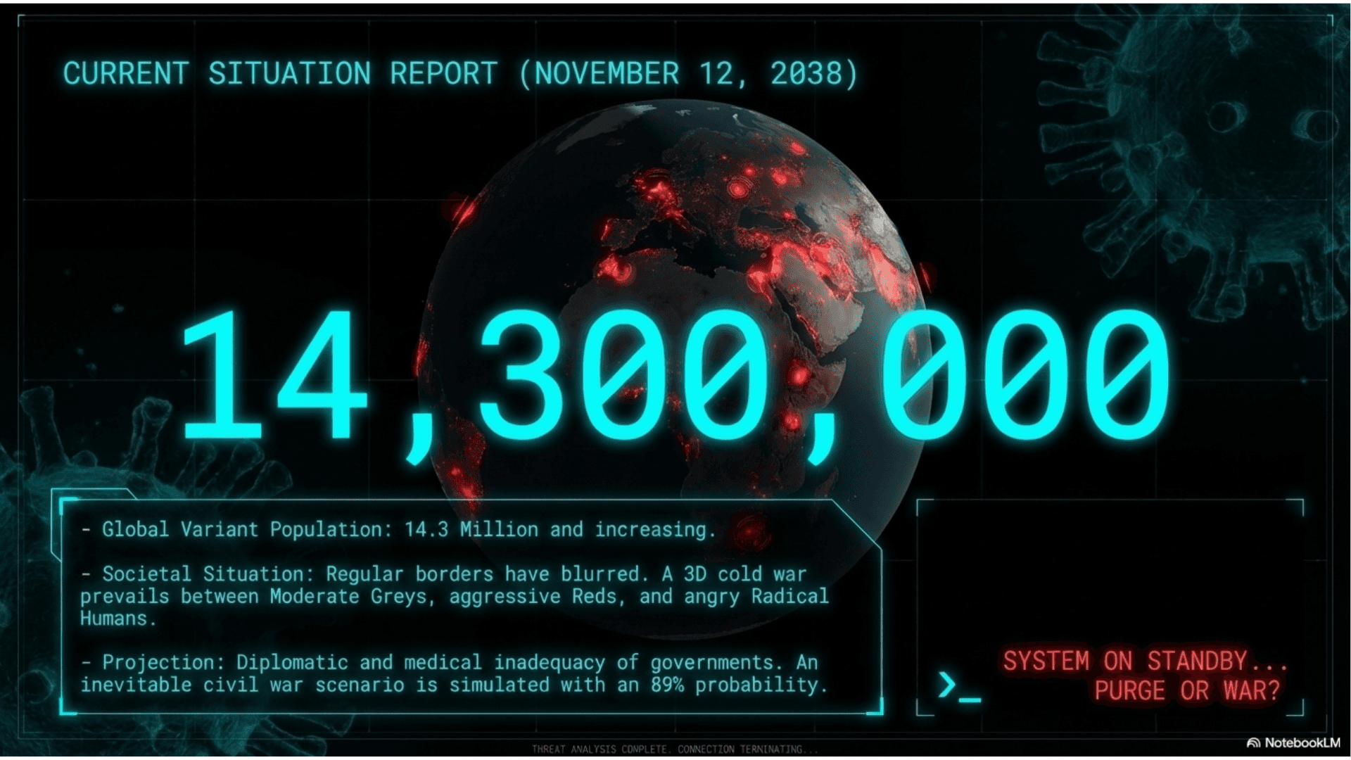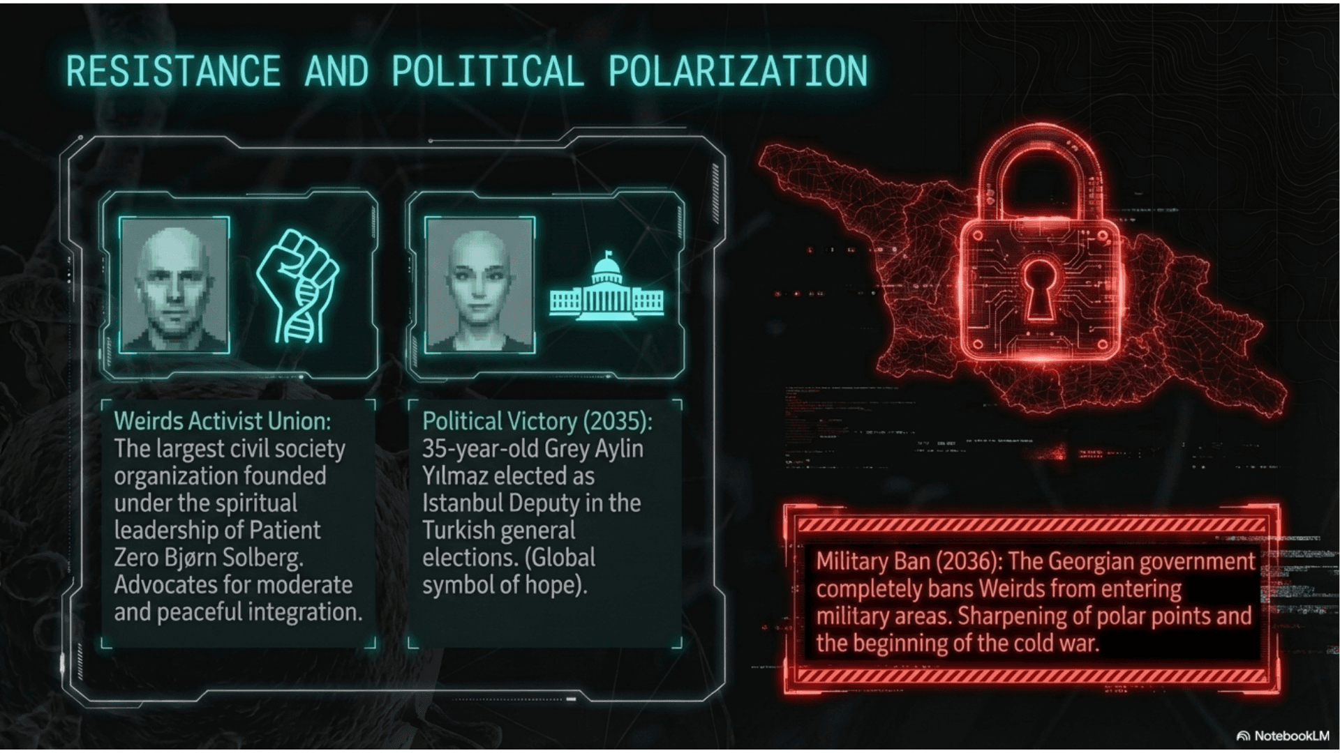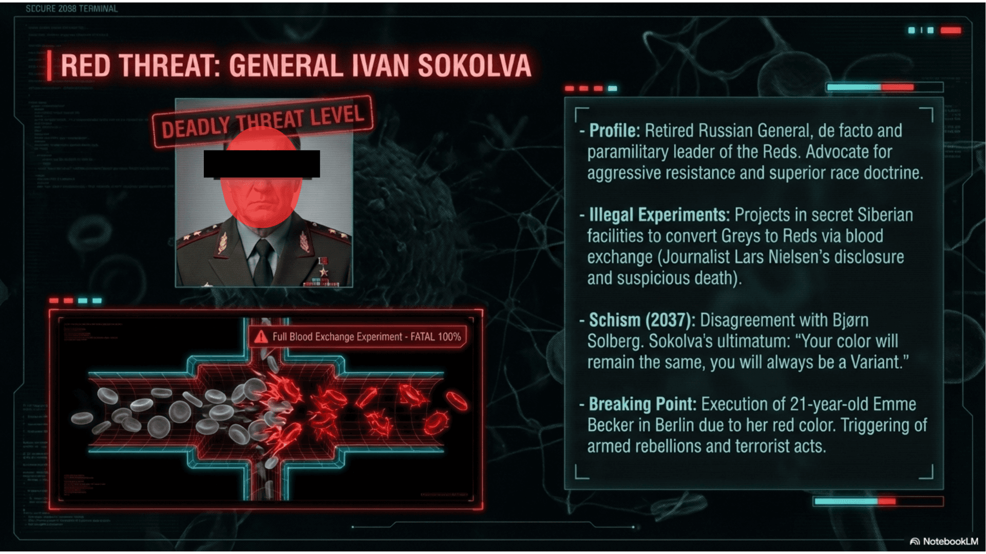 "The rise of the Red's leader, General Ivan Sokolva, and the increasing hate crimes pushed the Weirds into armed uprisings. As of the year 2038, the tension between the Weirds, whose numbers have reached 14.3 million, and normal humans is dragging the world into great chaos."