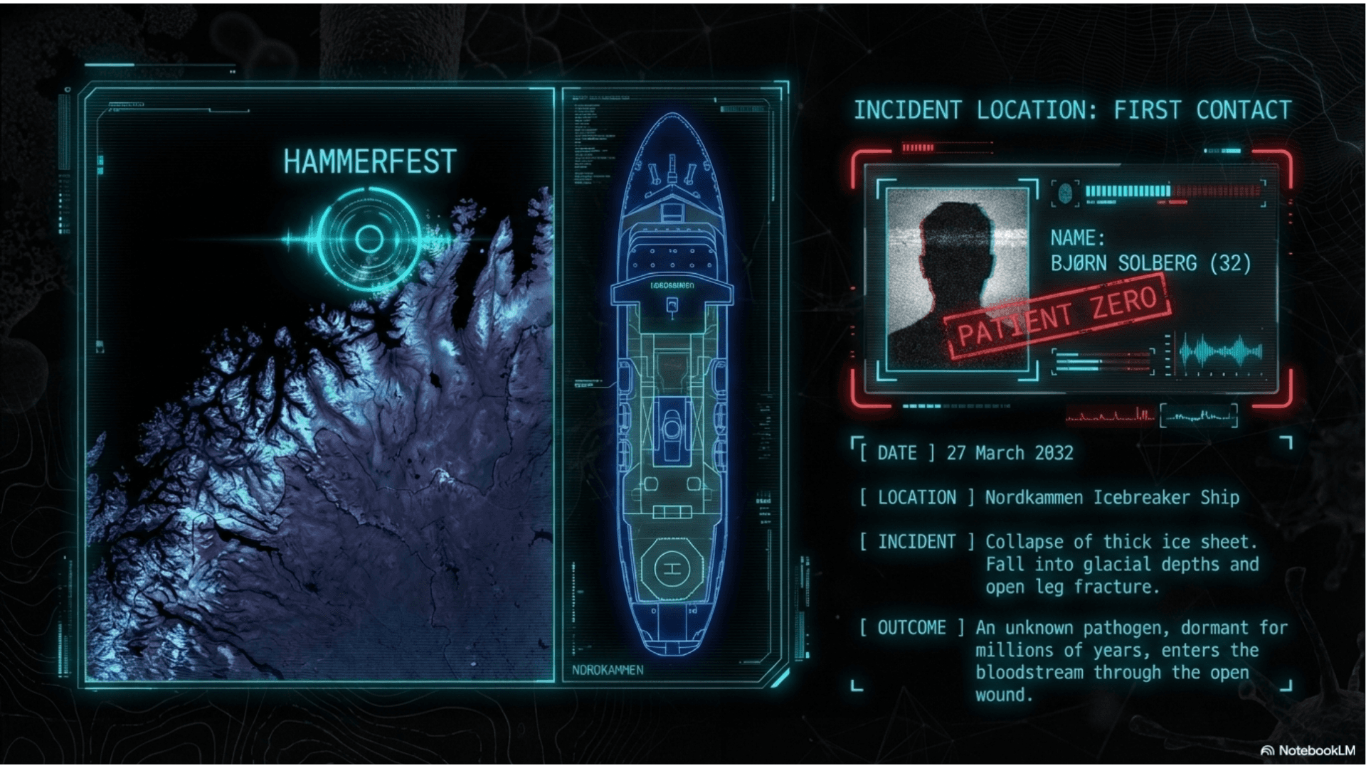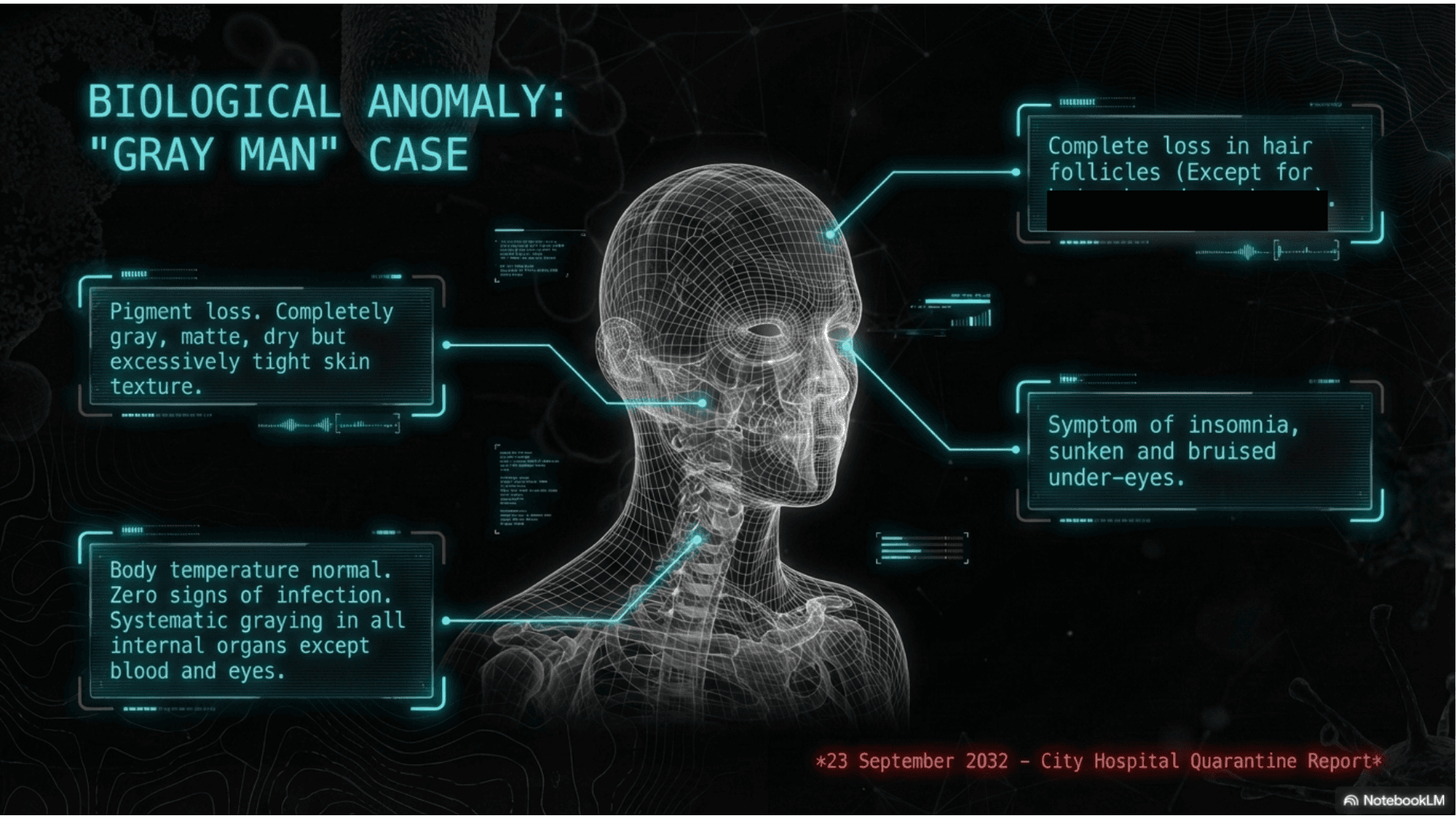 "Everything began with the accident of Norwegian Bjørn Solberg in the glaciers on March 27, 2032. A pathogen, dormant for millions of years, mixed with his blood and turned him into the first 'Gray Man' in history. This event was the first step of an irreversible change for human history."