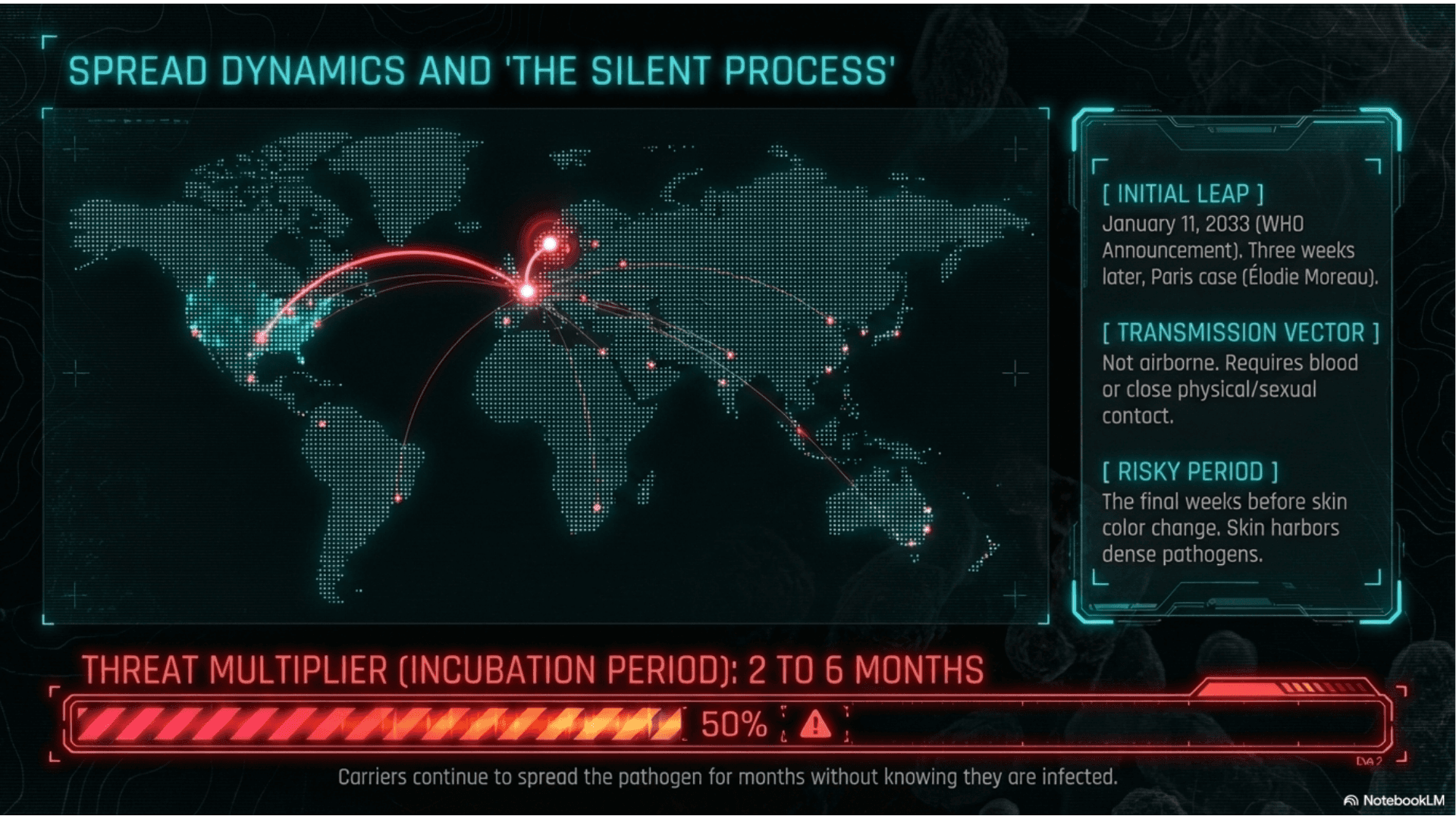 "The pathogen is not airborne; it spreads through close contact during the incubation period and via blood. The incubation period's variability, ranging from 2 to 6 months, has made it impossible to track the spread, leading to the emergence of a new group in society, referred to as 'Weirds'."
