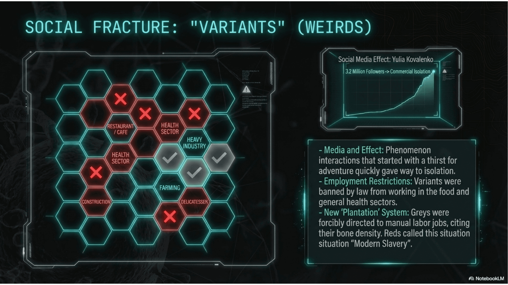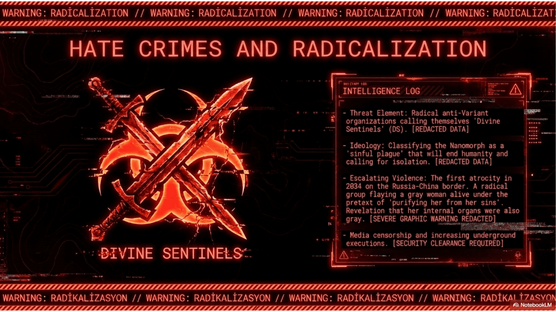 "As the weirds increased, society split in two. On one side, the peaceful 'Weirds Activist Union', and on the other side, radical hate groups like the 'Divine Sentinels' emerged. Grays were driven to heavy labor, while being excluded from the hospital and food sectors."