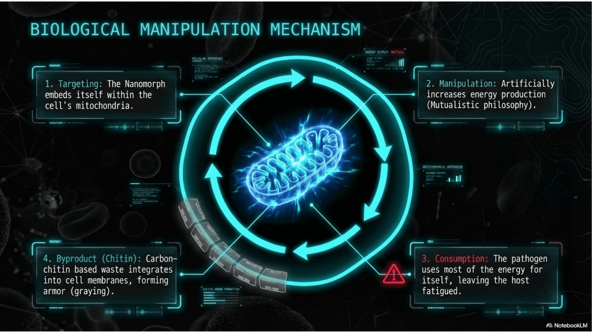 "Nanomorph is a mutualistic organism that targets mitochondria in cells to manipulate energy production. It does not harm the host; however, the resulting carbon-chitin-based byproducts gray the skin and strengthen it like armor, while the energy imbalance causes severe fatigue."