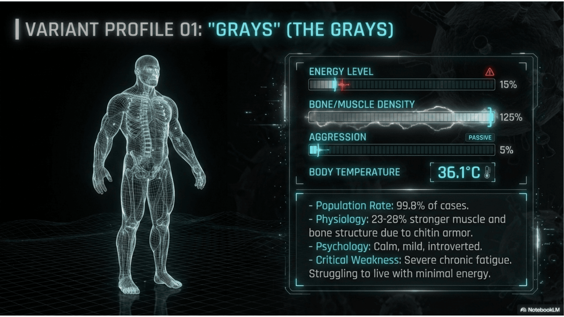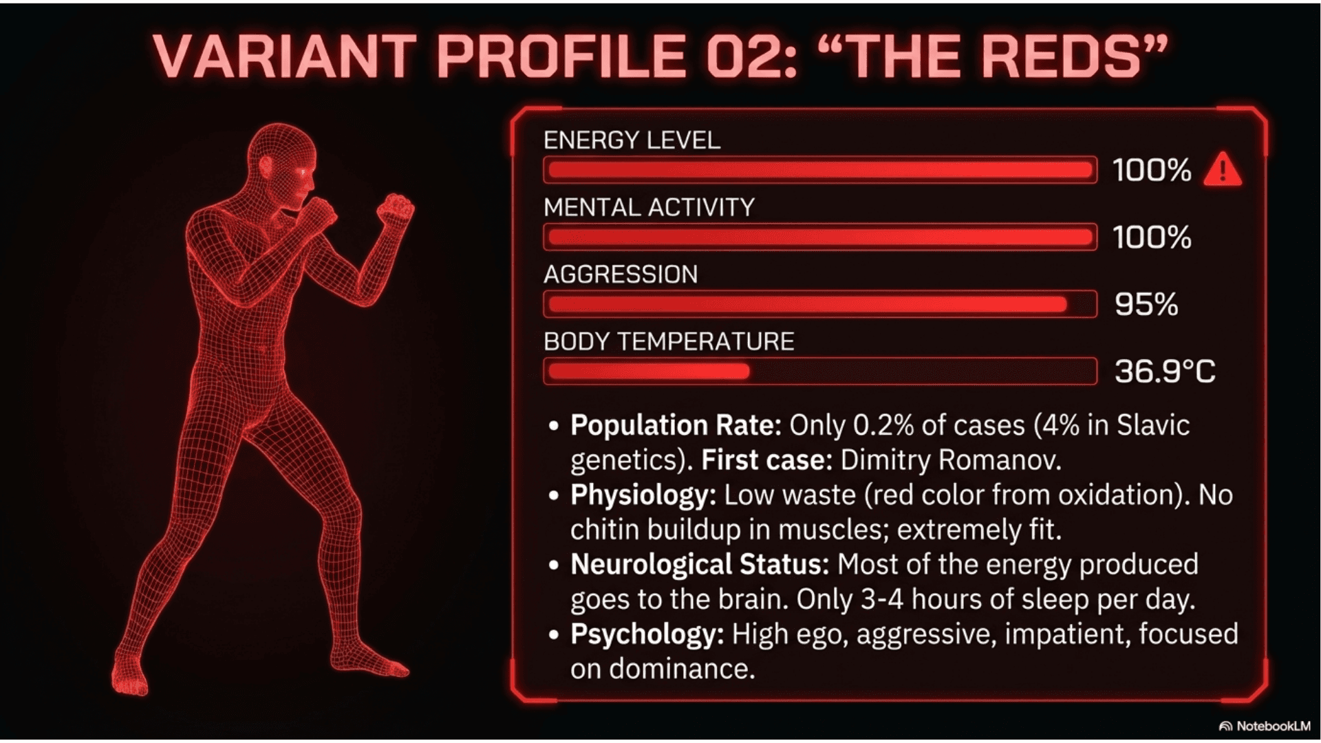 "Greys, who make up the vast majority of cases, have a chitin-based strong muscle structure but are constantly tired individuals. Reds, which constitute only 0.2% of the population, are fit, intelligent, energetic, and extremely aggressive due to their low waste rate."