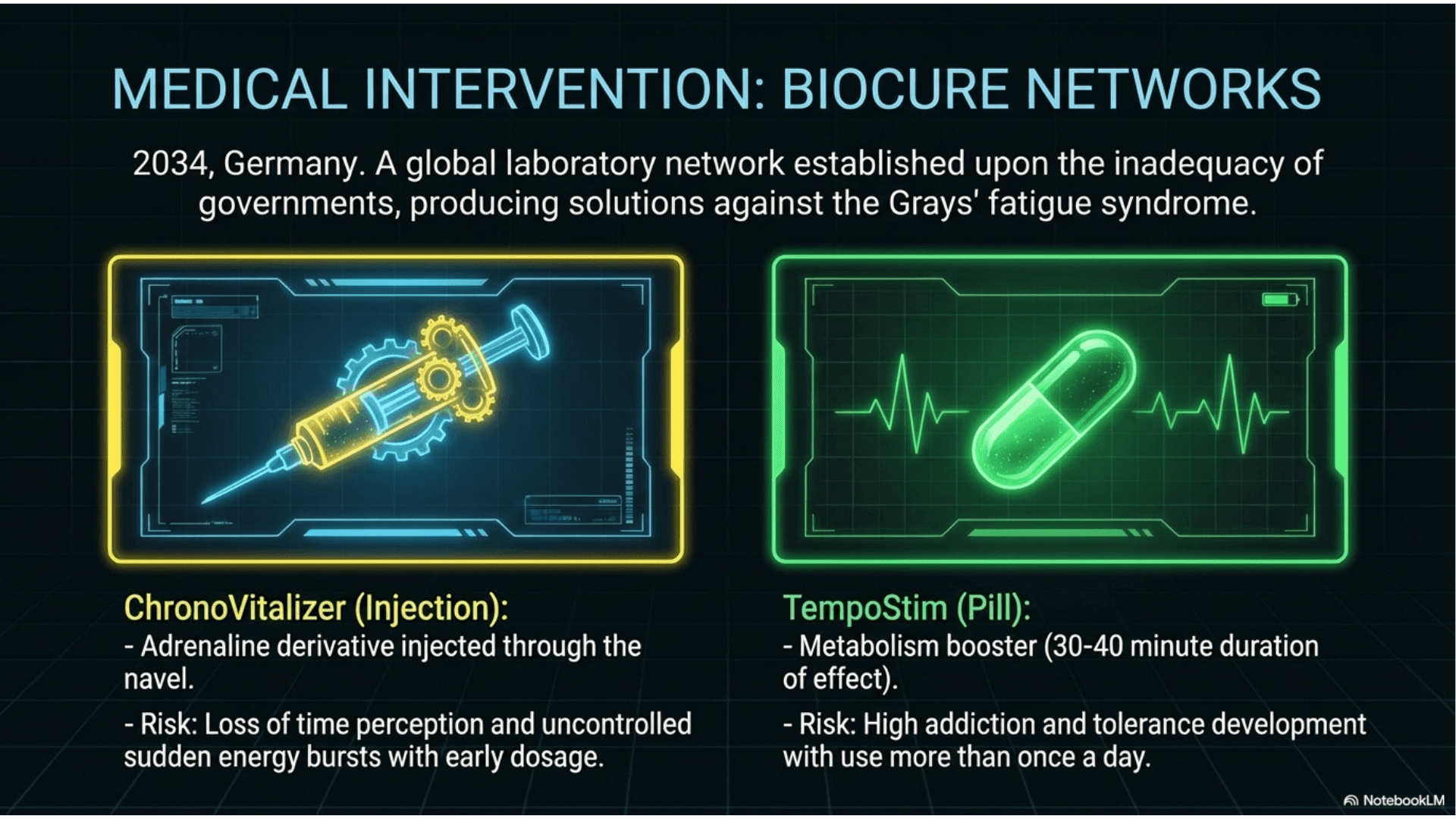 "When governments fall short, BioCure Networks steps in, developing the adrenaline-derived 'ChronoVitalizer' injection and the 'TempoStim' pill to solve the chronic fatigue of the Grilers, becoming the greatest health authority of this new era."